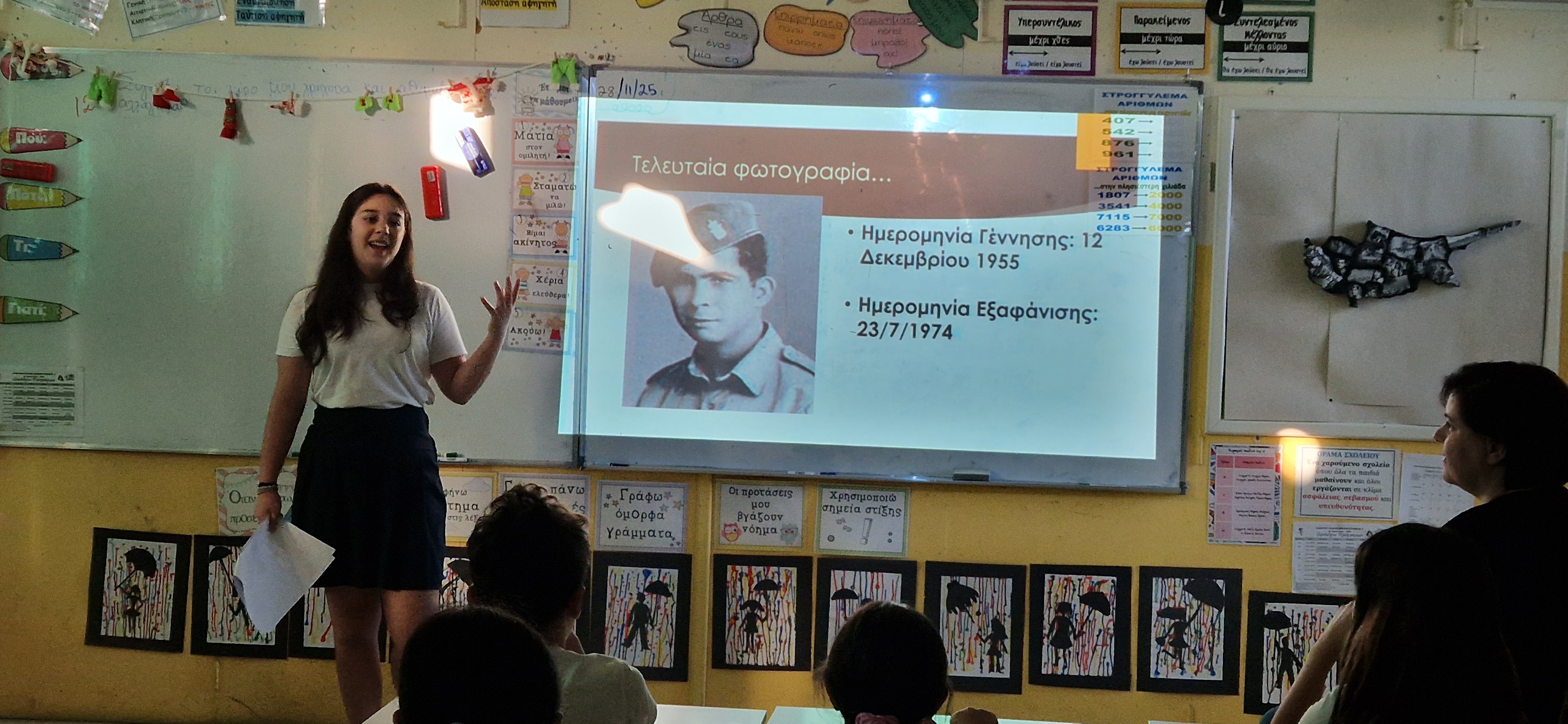 13. Τρίτη 2.12.2025: Το δεκαπενθήμερο "Γνωρίζω-Δεν Ξεχνώ-Διεκδικώ" ολοκληρώνεται με την εξαιρετική παρουσίαση της αγαπητής μαθήτριας Χριστίνας, που είχε την καλοσύνη να επισκεφθεί το σχολείο μας για λίγο και να παρουσιάσει, μέσα από μια δική της έρευνα, το δράμα των αγνοουμένων και του αγνοούμενου αδελφού της γιαγιάς της.
