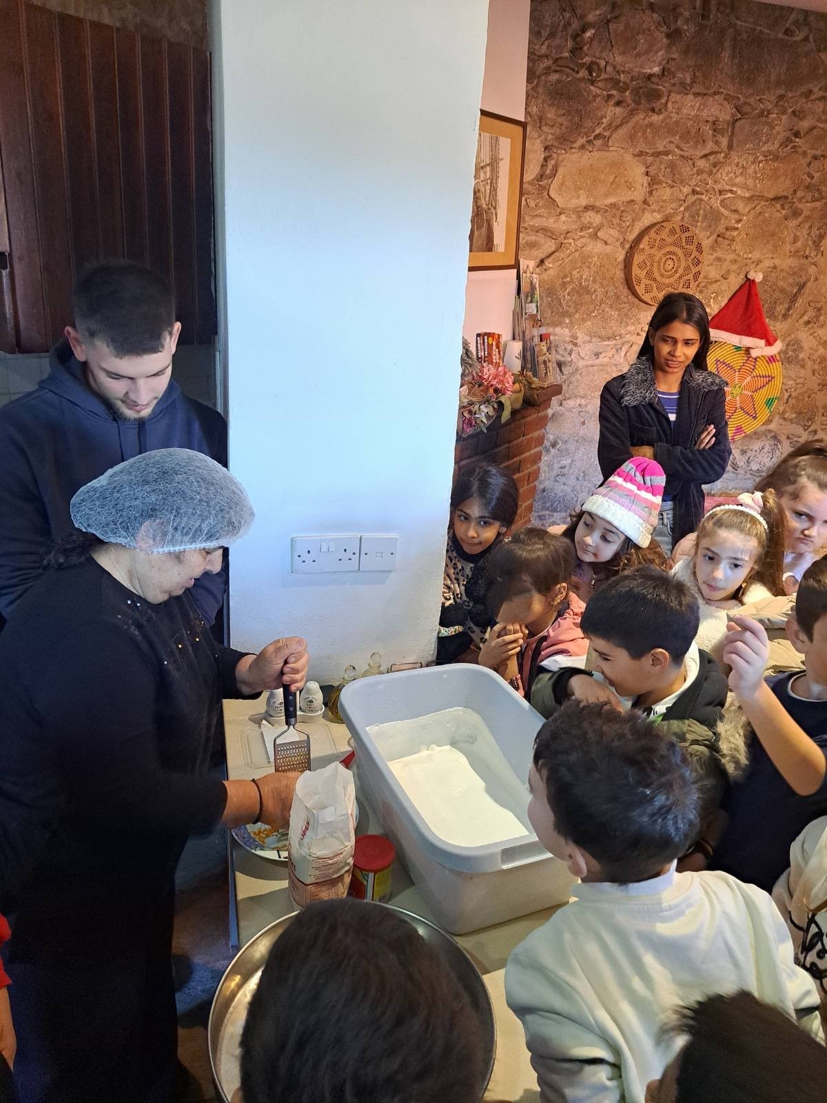 13. Παρασκευή, 22/11/2024: Είχαμε, σήμερα, την τιμή, να επισκεφθεί το σχολείο μας η τέως Δήμαρχος Λευκονοίκου κ. Ζήνα Λυσάνδρου και να μιλήσει σε παιδιά και εκπαιδευτικούς για το κατεχόμενο χωριό της και την προσφυγιά. Στη συνέχεια μοιράστηκε μαζί μας τη συνταγή για λευκονιτζιάτικες διπλοπισιήες, τις οποίες έφτιαξε για όλους, με τη βοήθεια της κ. Σούλας (γιαγιάς μαθητή του σχολείου μας), της εκπαιδευτικού κ. Νεκταρίας Αθανασίου, του βοηθητικού προσωπικού και των εκπαιδευτικών του σχολείου μας. Η εκδήλωση πραγματοποιήθηκε στην παρουσία του οικείου ΕΔΕ κ. Στέλιου Ιωαννίδη, ο οποίος κατάγεται από το κατεχόμενο Λευκόνοικο εκ μητρογονίας.